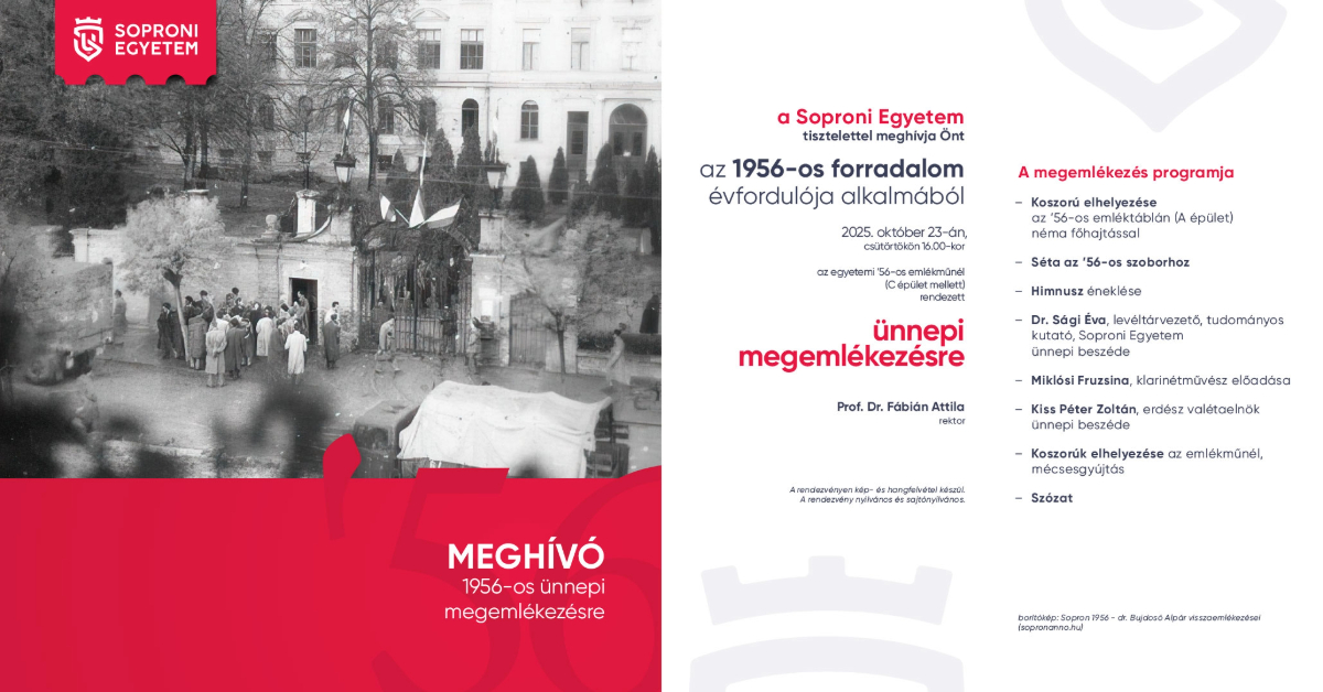 Október 23-án a Soproni Egyetem közössége méltóságteljes, bensőséges megemlékezéssel tisztelgett az 1956-os forradalom és szabadságharc hősei előtt. A rendezvény néma főhajtással vette kezdetét az egyetem A épületének sarkánál, ahol az emléktábla megkoszorúzásával adóztak az egybegyűltek a forradalom soproni és országos hősei előtt. Innen közösen sétáltak át az ’56-os emlékműhöz, ahol folytatódott a megemlékezés.