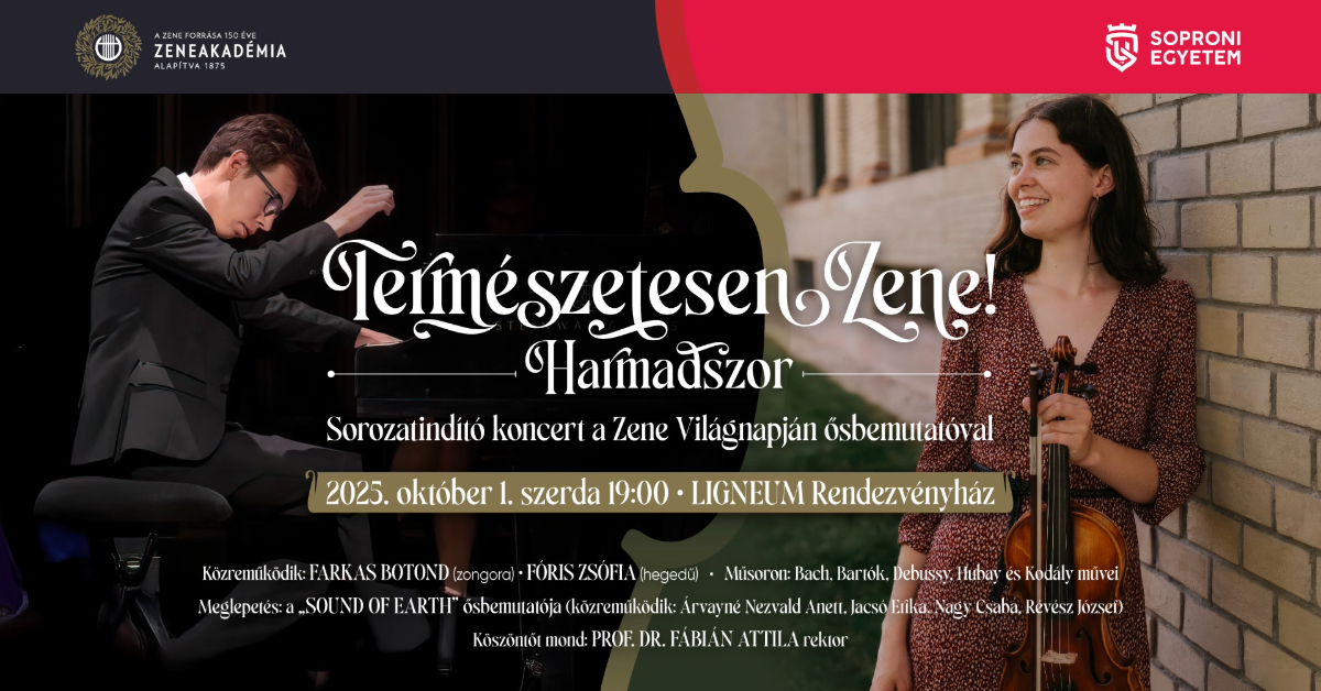 Különleges meglepetés várta a zenebarátokat a zene világnapján: 2025. október 1-jén felcsendült a Soproni Egyetem és a Zeneakadémia közös zeneszerzői pályázatának nyertes műve, Kocsák Gergely kompozíciója, a Sound of Earth. Az alkotást eddig élő hangszeres előadásban még senki sem hallhatta, így a koncert valódi ősbemutatóval gazdagította az egyetemi zenei életet.
