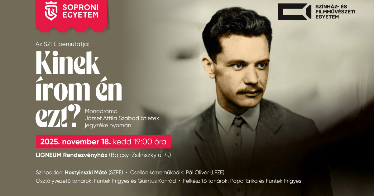 2025. november 18-án, kedden 19:00 órakor különleges színházi élményre invitáljuk az érdeklődőket: az SZFE bemutatja Kinek írom én ezt? című monodrámát, amely József Attila Szabad ötletek jegyzéke alapján készült.