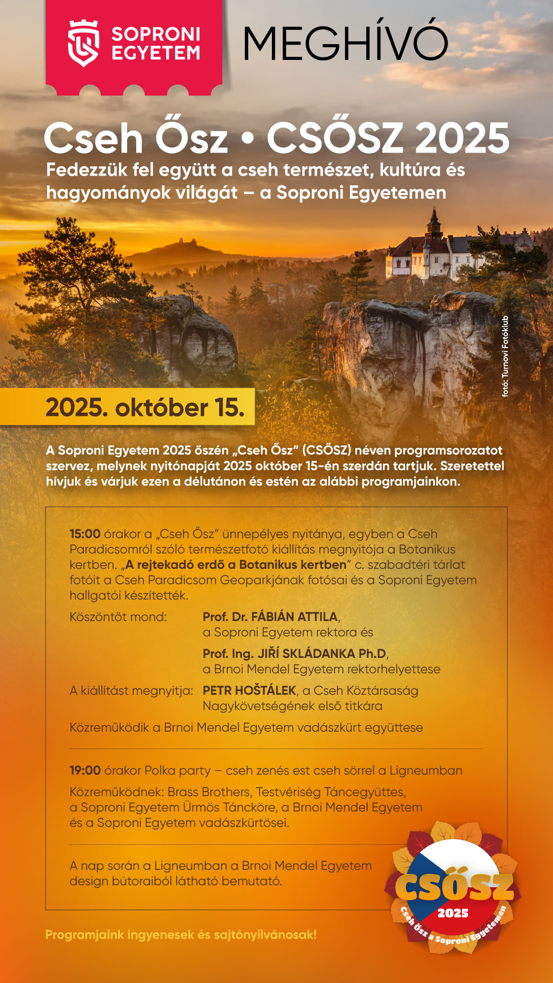 A Soproni Egyetem 2025 őszén egyedülálló kulturális programsorozattal várja az érdeklődőket: a „Cseh Ősz” eseménysorozat a cseh kultúra sokszínűségét mutatja be zenén, filmen, építészeten, designon, természetfotózáson és gasztronómián keresztül.