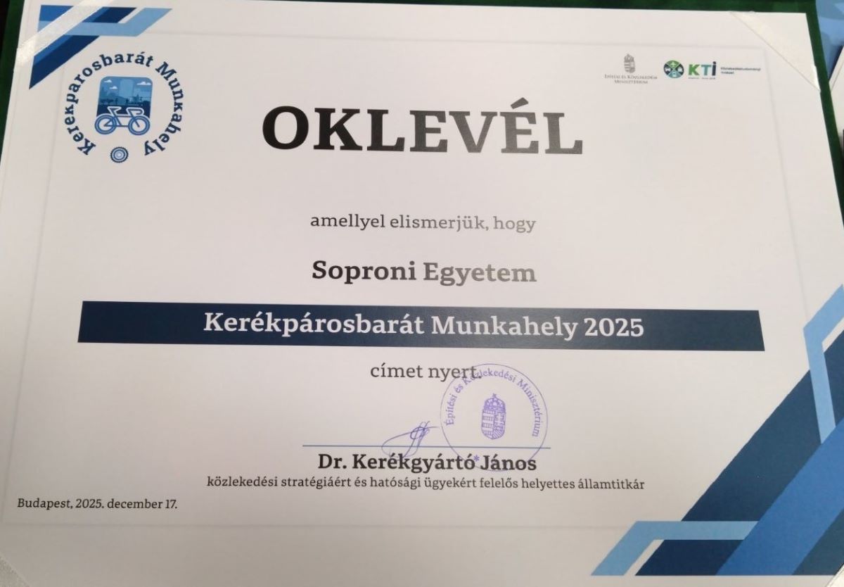 A 2025-ös évben immáron 17. alkalommal hirdette meg az Építési és Közlekedési Minisztérium a Kerékpárosbarát Település és Kerékpárosbarát Munkahely pályázatát. A „Kerékpárosbarát Munkahely” fokozatot azok a nagyvállalatok, kis- és középvállalkozások, valamint közintézmények nyerhetik el, akik jelentős lépéseket tettek környezetük biztonságosabbá és „zöldebbé” tételéért és pozitív példaként szolgálnak mások számára. Az pályázat lebonyolításáért a Magyar Közlekedéstudományi és Logisztikai Intézet felel. Az elismerést Kovács Kornél, az Építési és Közlekedési Minisztérium főosztályvezetője adta át a Soproni Egyetemnek Budapesten.