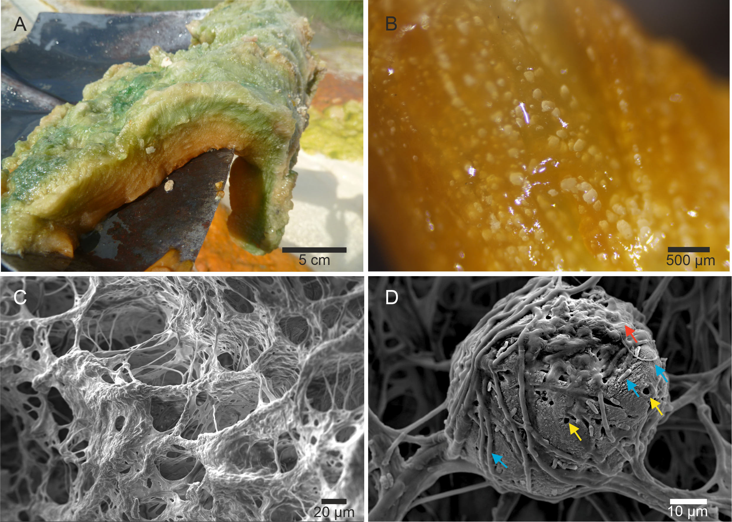 2. ábra: A biofilmek szerkezete. A) A biofilmet átszövő különféle hosszúkás baktériumsejtek eltérő színű rétegeket képeznek. B) Az ásványok gyöngysorszerűen helyezkednek el a biofilmben a fénymikroszkópos képen. C) A fonalas sejtek létraszerű hálózatot alkotnak a pásztázó elektronmikroszkópos képen. D) Változatos alakú sejtek (kék nyíl) és az általuk termelt nyálkaanyag (piros nyíl) stabilizálják az ásványokat. A baktériumok és az ásványok szoros kapcsolatát mutatja, hogy a sejtek elpusztulásuk során üregeket hagynak maguk után (sárga nyíl) (Makk Judit ábrája).