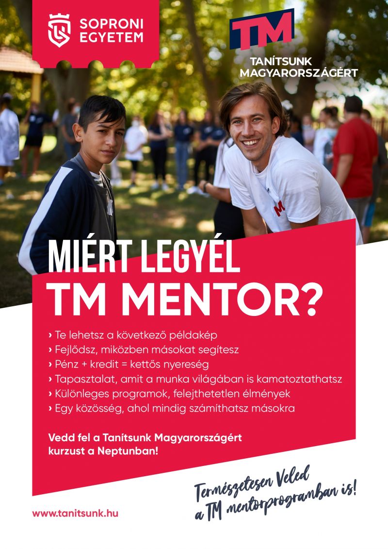 A Soproni Egyetem hivatalosan is csatlakozott a „Tanítsunk Magyarországért” országos mentorprogramhoz, amelynek célja azokon a kistelepüléseken élő általános iskolások mentorálása, akik a továbbtanulási lehetőségektől távoli településeken élnek. Ők azok, akik számára az új közösségbe való beilleszkedés és a rendszeres utazás akkora megpróbáltatást jelenthet, hogy megfelelő élmények hiányában középfokon nem szereznek szakmát, korai iskolaelhagyóvá válnak. A Tanítsunk Magyarországért Program keretében ezeket a gyerekeket segítik jól felkészített egyetemista “nagytestvérek”, mentorok, hogy még általános iskolás korukban megismerjék a településükön túli világ élményeit, a munka, a továbbtanulási és a kikapcsolódási lehetőségeket, hogy aztán a középiskolai átmenetet könnyen vegyék.