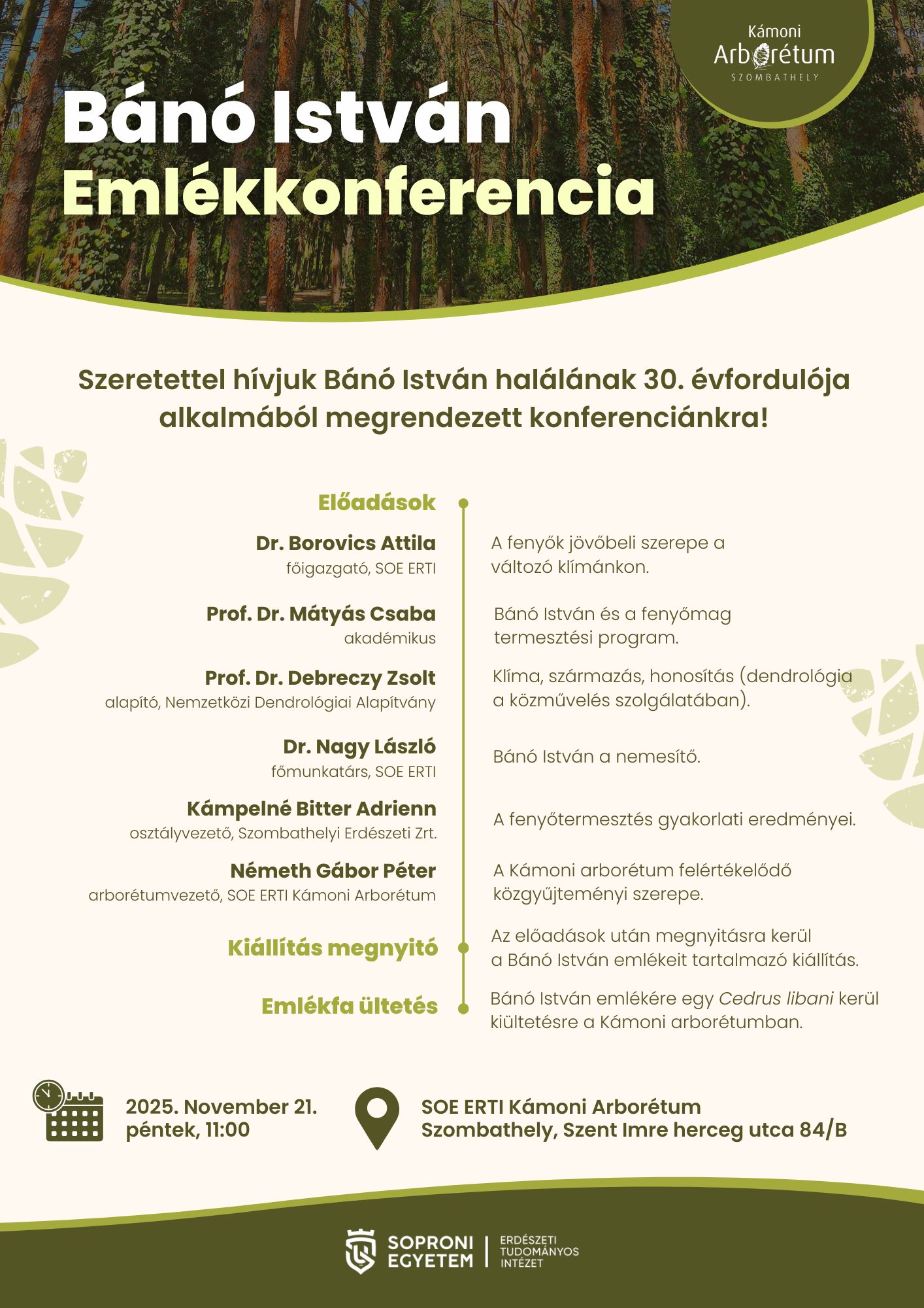 A Soproni Egyetem Erdészeti Tudományos Intézete szeretettel hív minden érdeklődőt Bánó István halálának 30. évfordulója alkalmából megrendezett emlékkonferenciára, amelyre 2025. november 21-én, pénteken 11:00 órakor kerül sor a SOE ERTI Kámoni Arborétumban